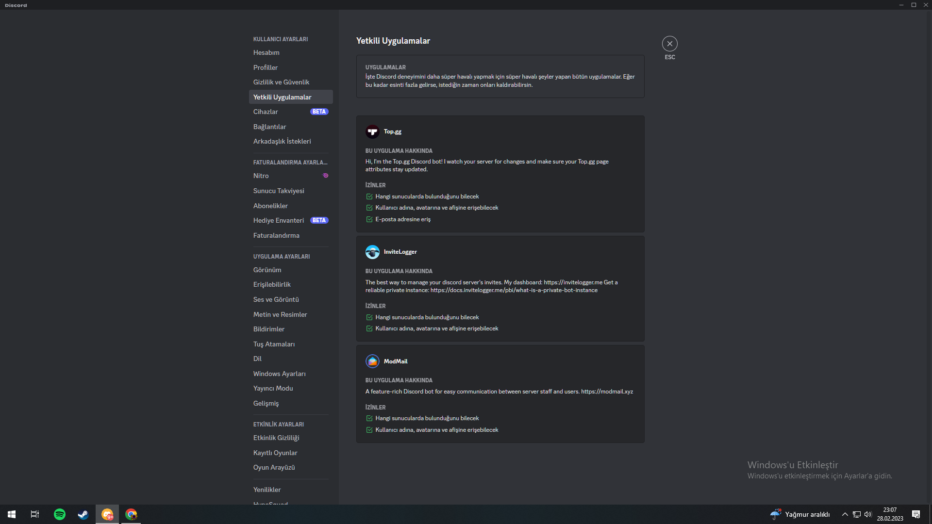 Buradan bilmediğiniz botların yetkilerini alın.