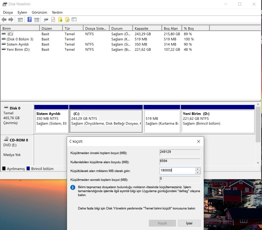Merhaba arkadaşlar hayırlı ramazanlar. Disk ayırma işlemi yapıyorum. C diskinden 180 GB ayırıp yeni disk oluşturmak istiyorum. Ama miktar girdikten sonra "küçülmeden sonraki toplam boyut" kısmı 0 olarak gözüküyor. Bu işlemi yapamama neden oluyor. Açıkçası korkuyorum diske bir problem olacağından. Neyi eksik ya da hatalı yapıyorum?