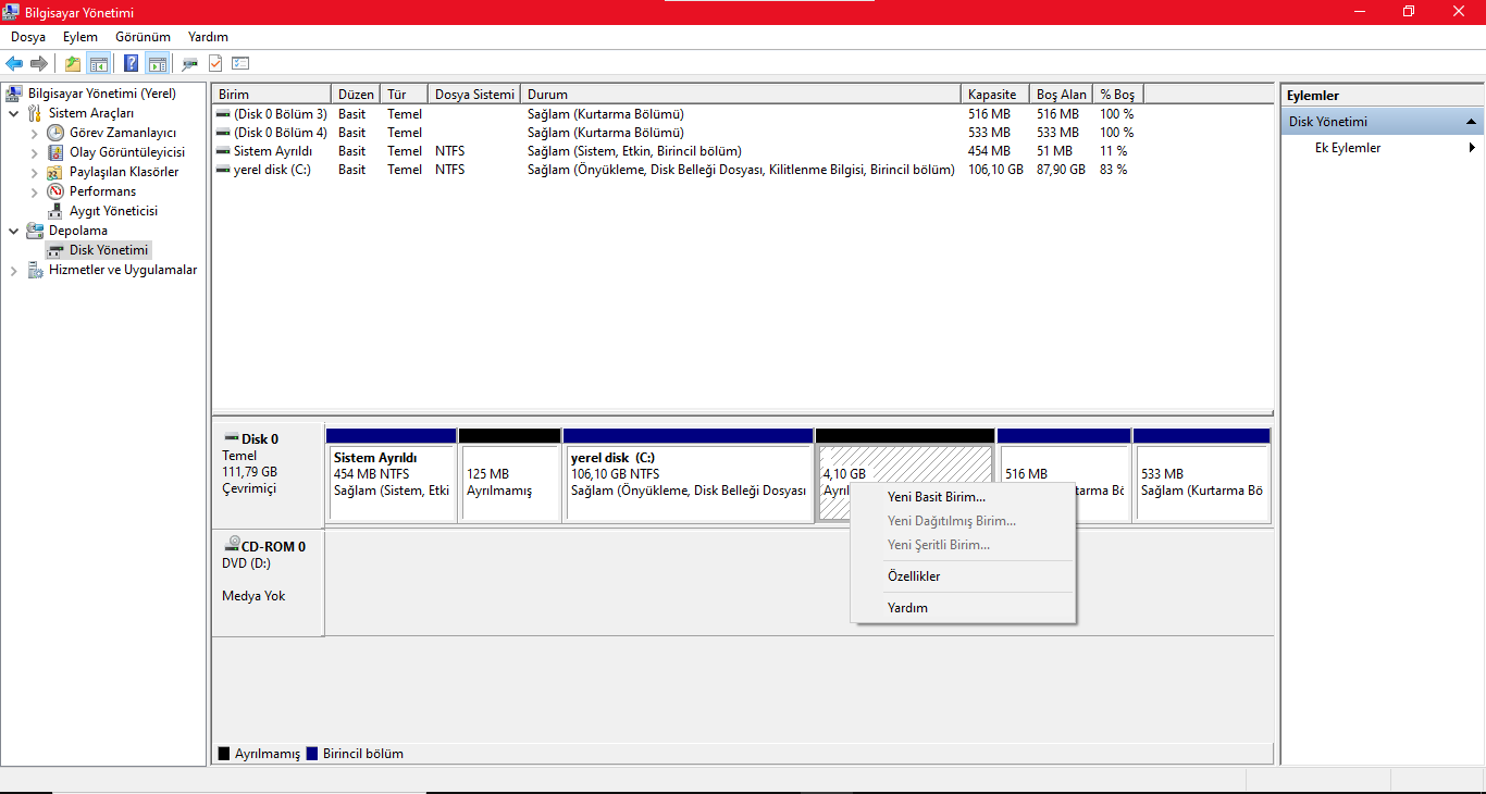 Diskimi böldüm, şimdi birleştirmeye çalışıyorum, olmuyor. Seçenekler çıkmıyor. Neden? Yeni basit birim dediğimde sağ tıklayıp hata veriyor.