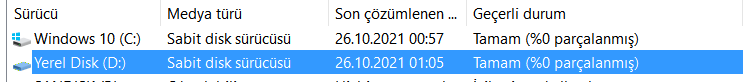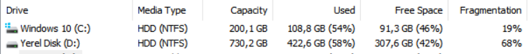 Windows'un kendi disk birleştirme uygulamasını açtığımda D diskinin parçalanma oranını %0 yani çok iyi olarak gösteriyor fakat Defraggler'da ise %68 olarak gösteriyor.