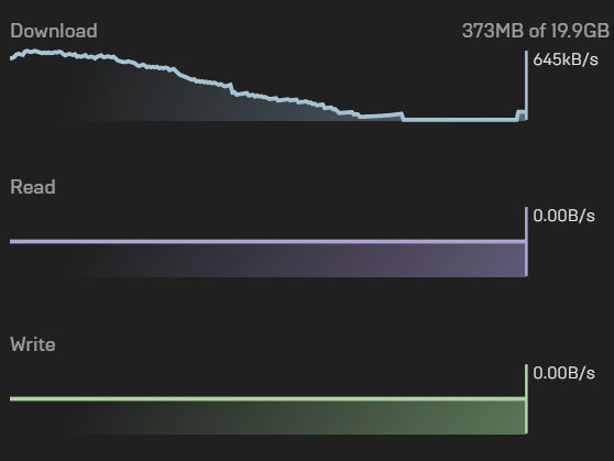 Epic'te ise durumlar böyle. Disk 300-400 MB arası başlyıro ver ara ara 0 MB kesik verdikten sonra hepten duruyor ve indirme 0'a düşüyor. Ayrıca Epic'te sadece C diskinde sorun oluşuyor.