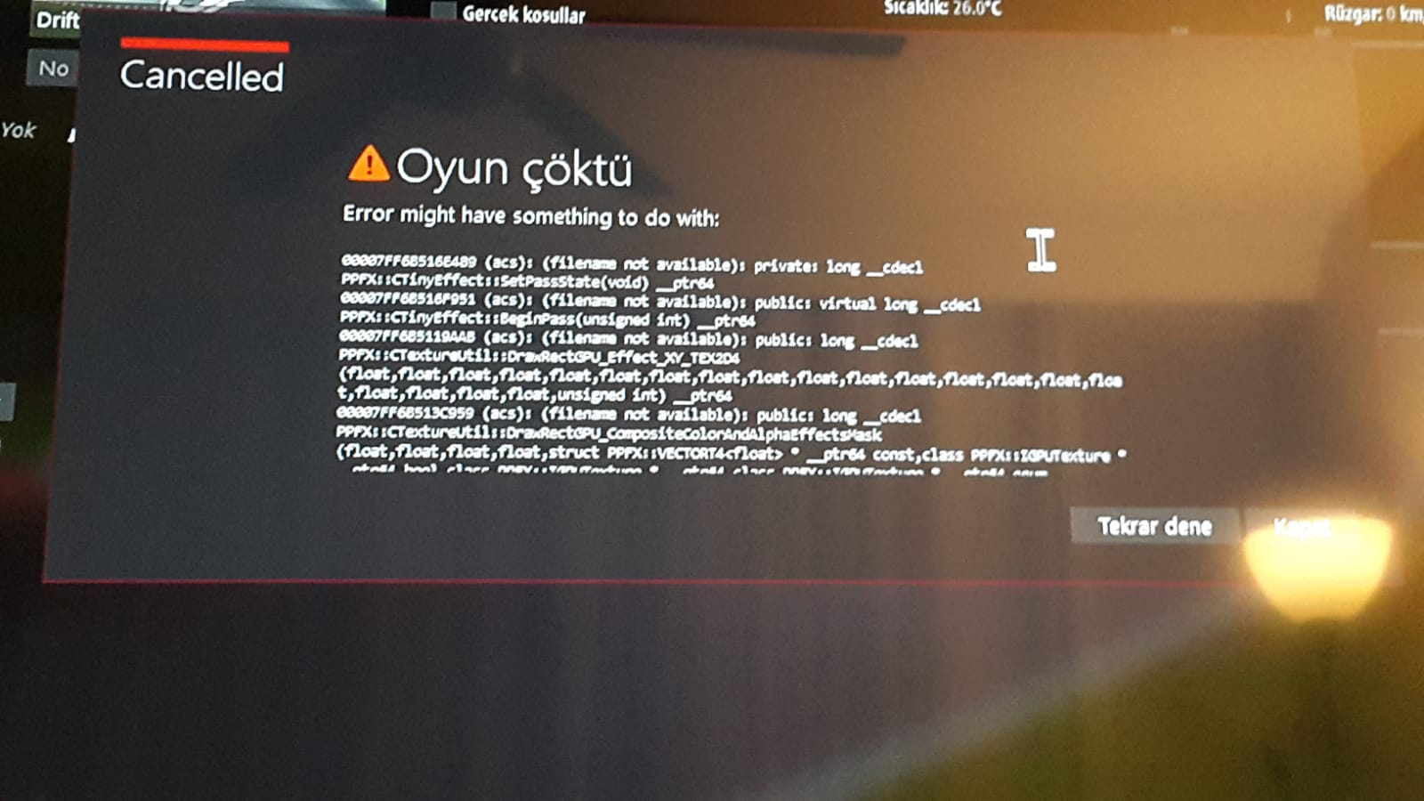 Merhaba iyi sosyaller. Bir arkadaşım Assetto Corsa indirmişti ve bana çok az disk alanının kaldığını söyledi. Bende ona disk sıkıştırmayı önerdim. Disk sıkıştırma işlemi yapılırken Assetto Corsa oynuyordu. Ancak bir anda hata verdi. Bana söyledi ve ben de resim istedim. Ancak anlayamadım. Sizin bir fikriniz var mı? Kendimi çok suçlu hissediyorum