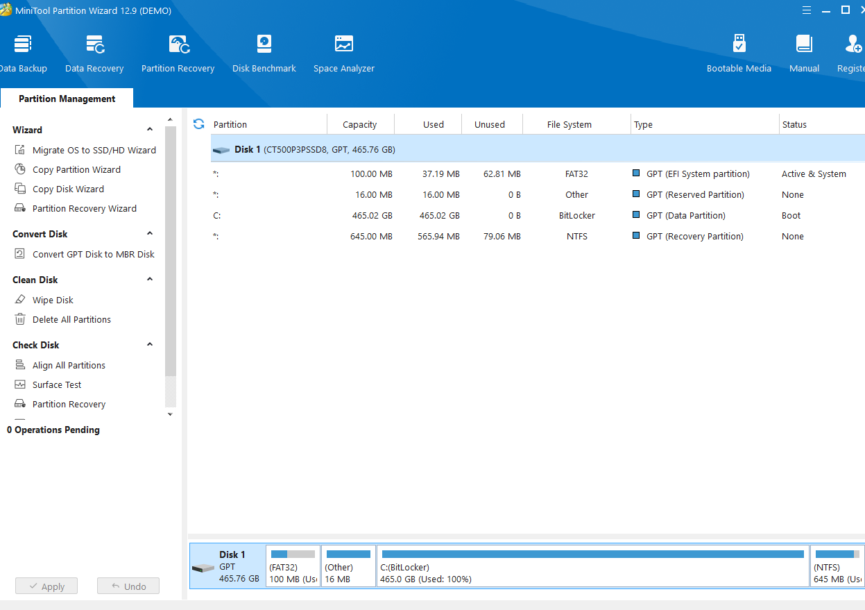 MiniTool Partition Wizard kurarak var olan tüm diskleri listeleyebilirsiniz, eğer diskler arası terslik var ise (MBR>GPT) gibi, o zaman başka yöntemler deneyebiliriz.