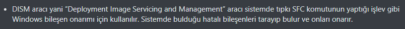 - DISM aracı yani “Deployment Image Servicing and Management” aracı sistemde tıpkı SFC komutunun yaptığı işlev gibi Windows bileşen onarımı için kullanılır. Sistemde bulduğu hatalı bileşenleri tarayıp bulur ve onları onarır.
