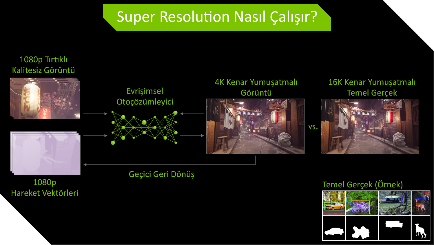 Oluşturulan 4K görüntü, algoritmanın veri tabanında bulunan 16K çözünürlükteki Ground Truth (Temel Gerçek) görüntülerle karşılaştırılarak iyileştiriliyor ve monitöre gönderiliyor.