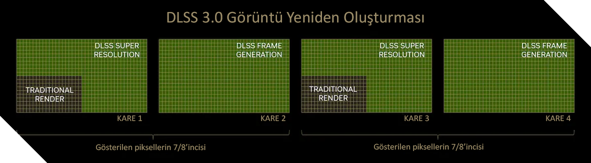 DLSS 3.0, Frame Generation (Kare Oluşturma) denilen bir özellik sunuyor bizlere. Bu özellik, görüntünün yeniden boyutlandırması bir yana, üstüne bir de oluşturulan 2 görüntü arasına sıfırdan, yeni bir kare oluşturarak yerleştirilmesini sağlıyor.