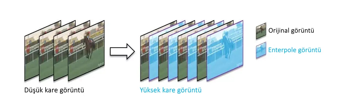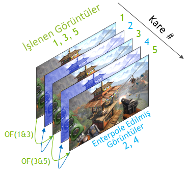 Bu görüntüler, oluşturulan vektörlerle Optical Multiframe Generation (Optik Çoklu Kare OIuşturma) ağına dahil edilerek sıfırdan kareler yaratılıyor, bu kareler monitöre gönderiliyor ve Super Resolution ile oluşturulan karelerin arasına yerleştiriliyor. Böylece 2 katından fazla kare hızı oluşturulmuş oluyor.