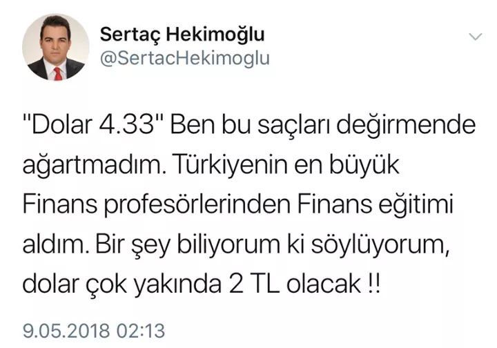 Demek bu yüzden profil fotoğrafında saçları siyah.Resimde olan arkadaş kim bilmiyorum. Ama doların 2 TL olacağını söylüyor. Bunlar ne yiyip ne içiyor da bunları söyleyebiliyor anlamış değilim.