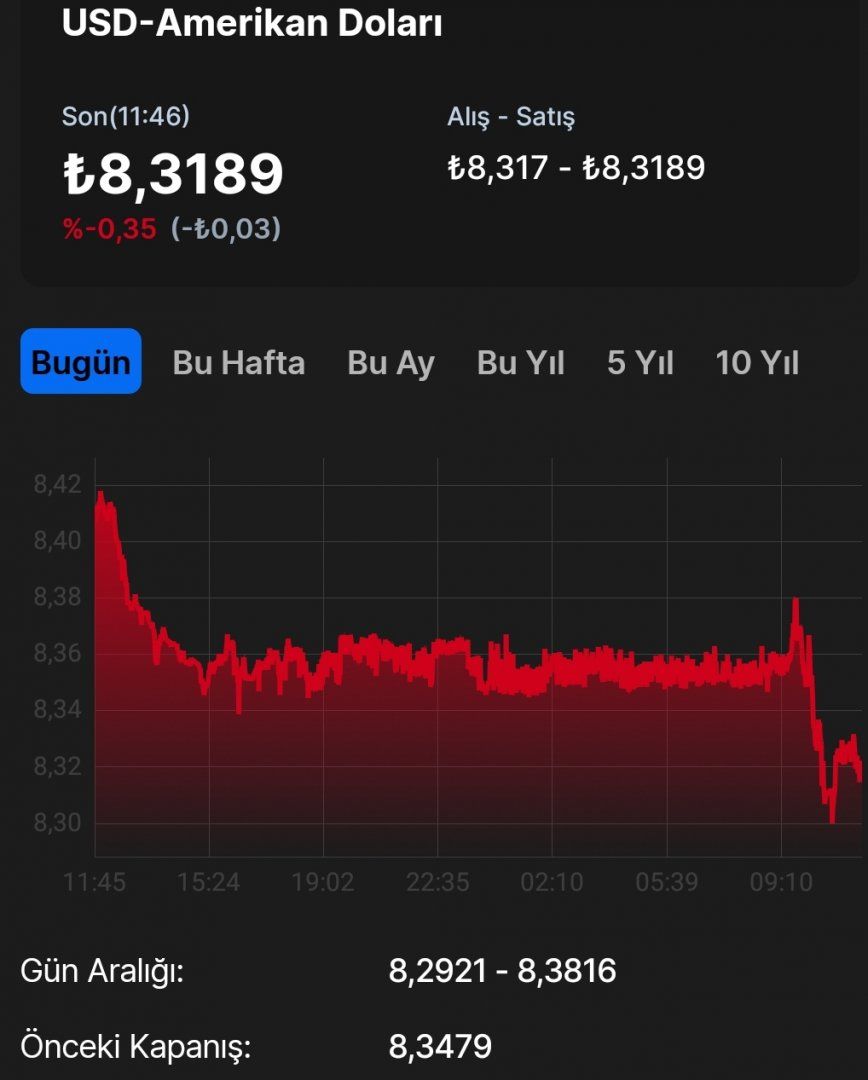 Dün, en düşük 8,3320'yi gören dolar/TL, günü yüzde 1,2 azalışla 8,3539'dan tamamladı.