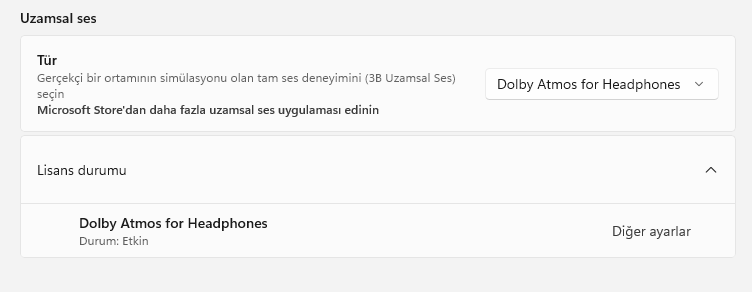 Windows 10 kullanırken sağ aşağıdan ses ayarlarına sağ tıklayıp uzamsal ses kısmından Dolby Atmos'u veya Windows Sonic for Headphones'u seçebiliyordum ve sorunsuz çalışıyordu. Fakat Windows 11'e geçtikten sonra ses kalitesinin değiştiğini fark edince uzamsal sese baktım ve hem kapalı gözüküyor hem de herhangi bir şeyi kulaklık kullandığım halde seçemiyorum (Arctis 3).