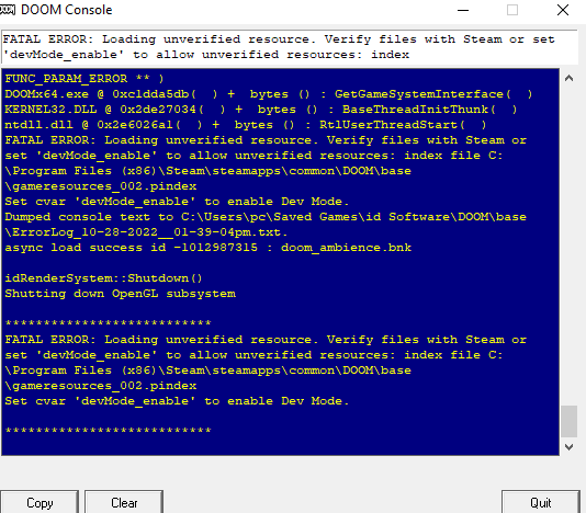 FATAL ERROR: Loading unverified resource. Verify files with Steam or set 'devMode_enable' to allow unverified resources: index file C:\Program Files (x86)\Steam\steamapps\common\DOOM\base\gameresources_002.pindex