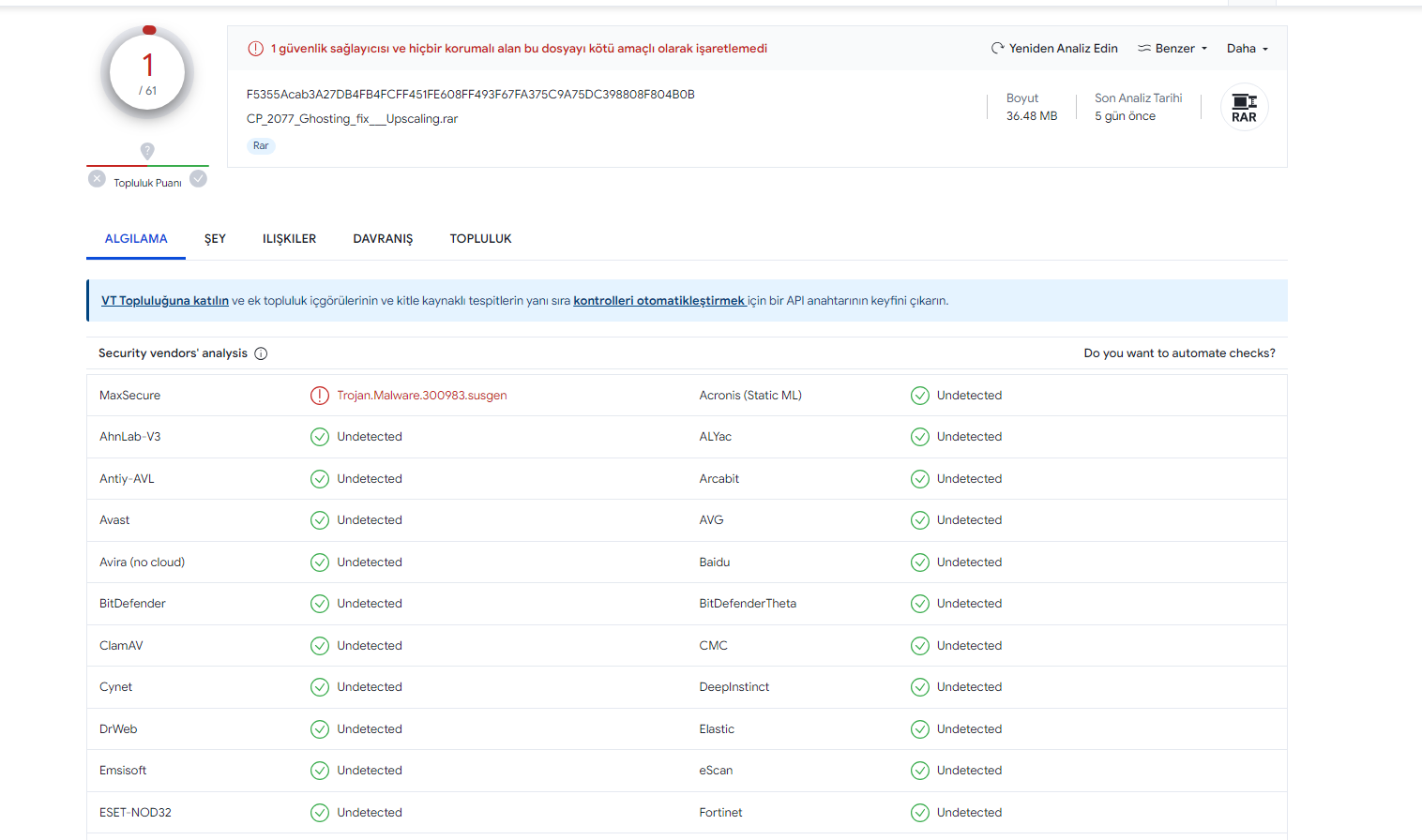 Hocam içinde her hangi bir exe yok. Cyberpunk için FSR3 modu dosyaları var sadece. İçindeki her bir dosyayı tek tek taratayım mı?Aynen öyle. Rar dosyasını çıkartın ve içerisindeki exe'yi taratın.