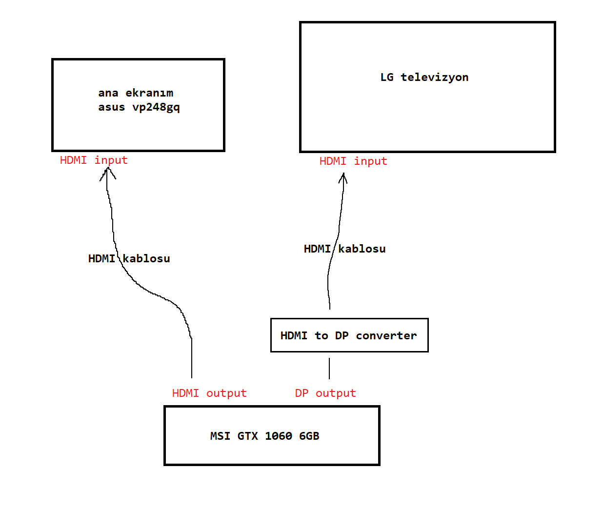 Başlık, kendini pek anlatamıyor. Dolayısıyla ilk önce ekteki görsele bakmanızı tavsiye ederim. Normalde sadece ana ekranımı kullanıyorum. GTX 1060'ın yalnızca bir tane HDMI Output'u var. Onunla bağlıyorum ana ekranımı. Fakat büyük ekranda dizi, film vb. izlemek için televizyonu da bağlamak istedim. Fakat ekran kartında tek HDMI out olduğu için elimdeki HDMI kablosunu DP'ye çevirecek bir adaptör aldım. Ama her iki ekran da takılı olduğu zaman, ana ekranımın kontrast ve parlaklık ayarları çok tuhaf görünüyor. Fakat ben sürekli "eğil kablo tak, eğil geri çıkart" şeklinde uğraşmak istemiyorum. Bir kere takayım kalsın istiyorum.
