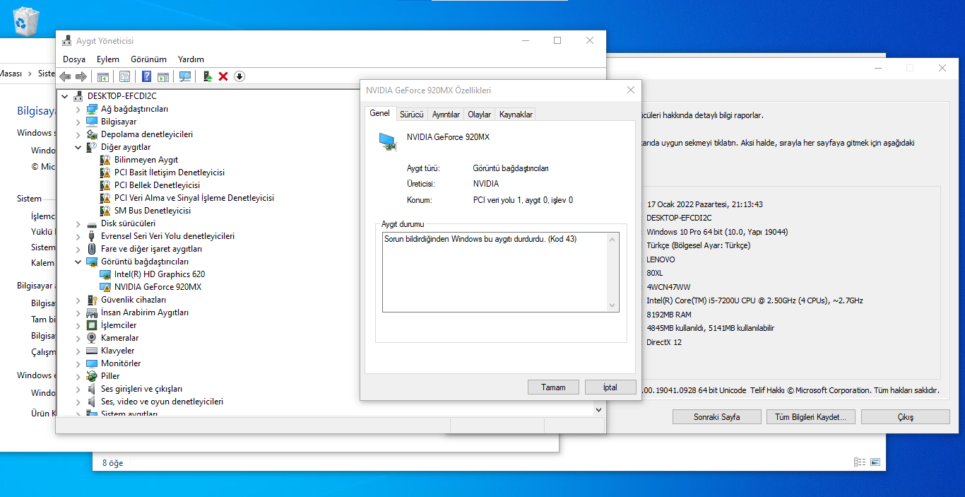 Yaklaşık 1 yıl önce bilgisayarımda AutoCAD kullanırken sistemim çökmüştü. İşletim sistemini baştan yükledikten sonra ekran kartını kullanamadığımı fark ettim kod 43 hatası veriyordu kendi driverının en güncel halini yüklerken "DPC_WATCHDOG_VIOLATION" kodlu mavi ekran hatasını aldım birkaç yöntem denedim BIOS güncellemesi yaptım Lenovo'nun kendi sitesindeki driverları yükledim ancak mavi ekran hatası aldım tekrar.