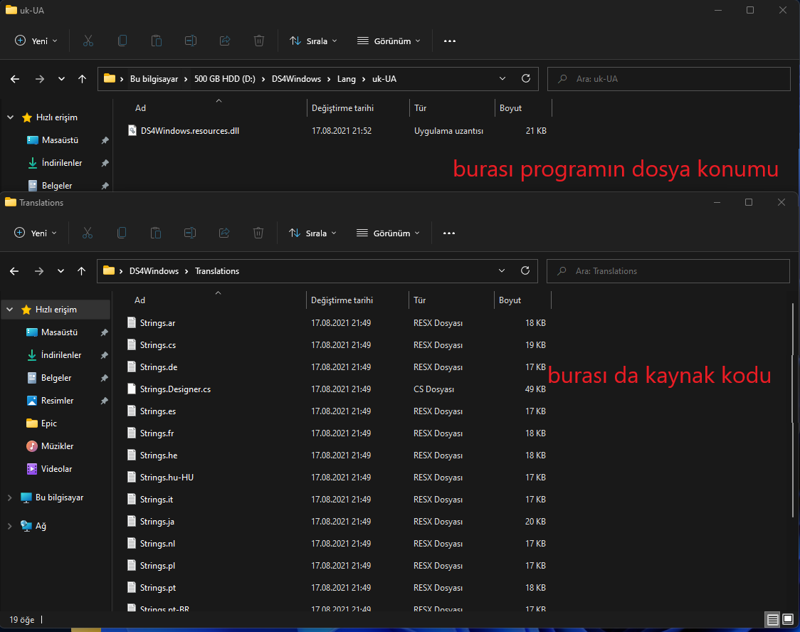 Merhabalar, DS4 Windows programını Türkçeye çevirmek istiyorum. Program açık kaynak kodlu bir program, Github'dan kaynak kodunu indirdim. "Translation" adlı klasörde .resx uzantılı dosyalar var fakat programın kendisinde dil dosyaları .dll uzantılı. Resimlerle göstereyim: