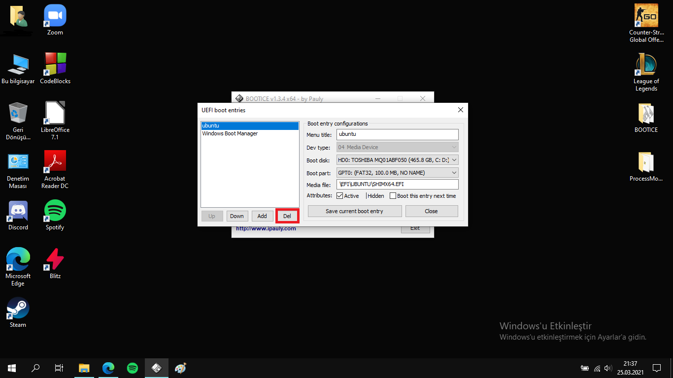 Evet asıl olayımız burada. Buradan çok kolay bir şekilde GRUB'u kaldırabilir veya sistemin hangi Bootlader ile başlamasını istiyor iseniz onu ilk sıraya alıp ayarlayabiliyorsunuz. Biz şimdi Linux'u siliyoruz o yüzden buradan GRUB'u seçip (dağıtıma göre ubuntu, Manjaro vs. yazabilir) sonra "del" tuşuna basıyoruz ve GRUB siliniyor