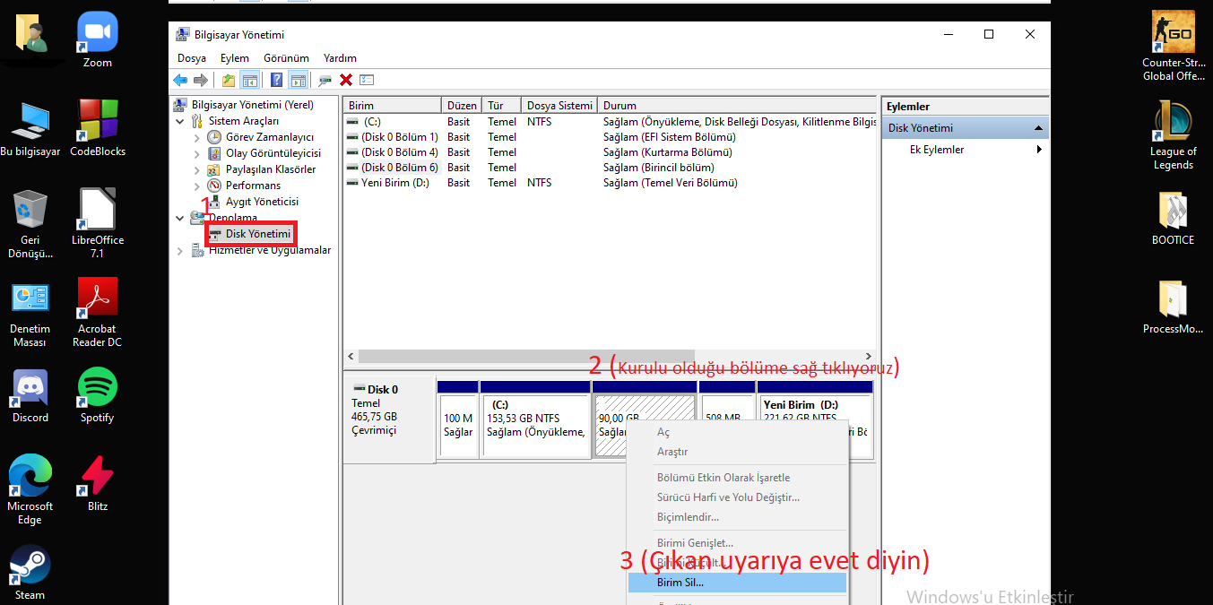 Karşımıza böyle bir ekran gelecek. Buradan Disk Yönetimine basıyoruz ve Linux'un kurulu olduğu yeri sap tıklayıp siliyoruz.