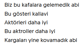 Bir tane grup vardı eskiden, "Lem yelid ve löp yutar." gibi oldukça yaratıcı bir söz yazan; acaba nerede o?![]()