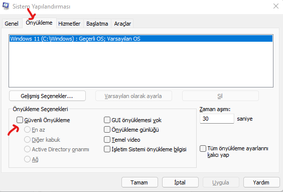 Sürücüyü kaldırırken güvenli moda almak için msconfig penceresinden Önyükleme sekmesine gelip Güvenli Önyükleme seçeneğini seçerek yeniden başlatın.