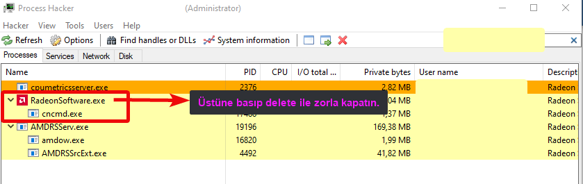 - Resimdeki işlemi yapın. (Radeonsoftware.exe'ye tıklayıp delete yapın. Altındaki cnccmd.exe'ninde kapandığından emin olun.
