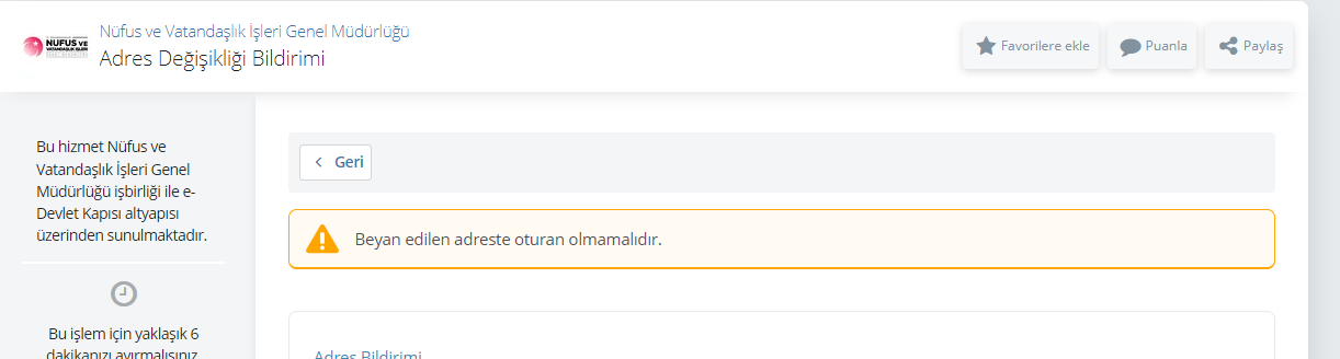 İkametgah olarak kirada oturduğum evi göstermek istiyorum, şu an ailemin oturduğu şehir gözüküyor. Bende şu anda oturduğum evin adres bilgilerini giriyorum ancak şöyle bir hata alıyorum. Yanlış yerden mi deniyorum? Konudan anlayan yardımcı olabilir mi?