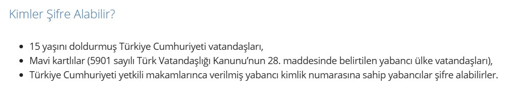 15 yaşını doldurmuş T.C. Vatandaşları üzerinde T.C. Kimlik numarasının bulunduğu aşağıdaki kimlik belgelerinden birini ibraz ederek şifre alabilmektedir.