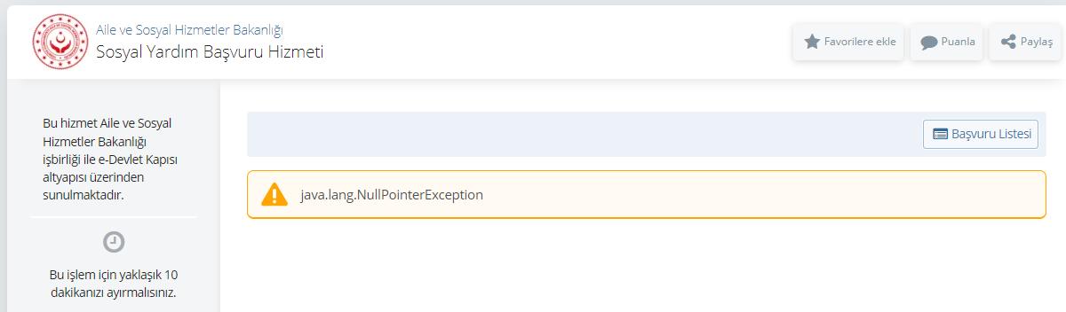 Merhaba dostlar. e-Devlet üzerinden doğal gaz yardımı için sosyal yardım sayfasından başvuru yapıyordum fakat tüm bilgileri doldurup başvuruyu tamamladıktan sonra "Java. Lang. Nullpointerexception." şeklinde bir hata alıyorum. Bunun sebebi başvurular bittiği için mi yoksa sistem kaynaklı bir hata mıdır? Bir haftadır ara ara deniyorum fakat ne yapsam nafile. İnternetten baktığım kadarıyla herhangi bir son tarihte bulunmuyor. Konu hakkında bilgisi olan var mıdır acaba?