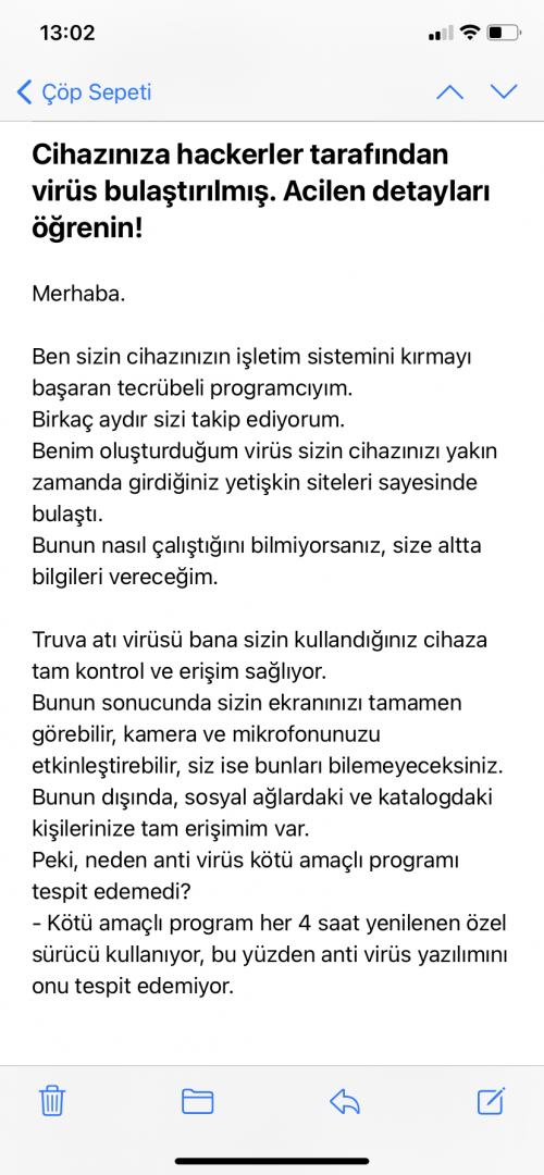 Evet arkadaşlar, bugün epostama baktığımda hiç tanımadığım bir kişi bana böyle bir tehdit mesajı yolluyor ancak tehdit ettiği konu katiyen olmadı. Sizce ne yapmalıyım?