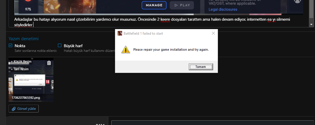 Arkadaşlar bu hatayı alıyorum. Nasıl çözebilirim, yardımcı olur musunuz? Öncesinde 2 keere dosyaları tarattım ama halen devam ediyor. İnternetten EA'yı silmemi söyledirler denedim yine olmadı.
