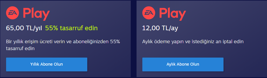 Aylık 12 TL, yıllık da 65 TL olmak üzere abone olabiliyorsunuz, EA play ve Pro olarak ayırmamışlar.