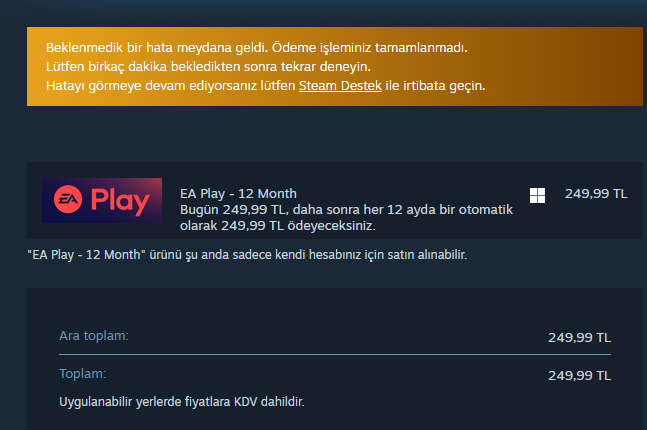 Steam hesabımda para olmasına rağmen 1 yıllık EA Play üyeliği alırken hata yiyorum.