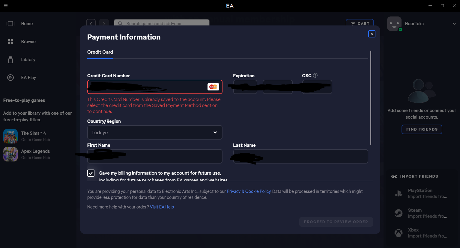 Hesabı yeni açtım ve kartımı daha önce kaydetmedim ama bu hatayı veriyor. Ne yapmalıyım?