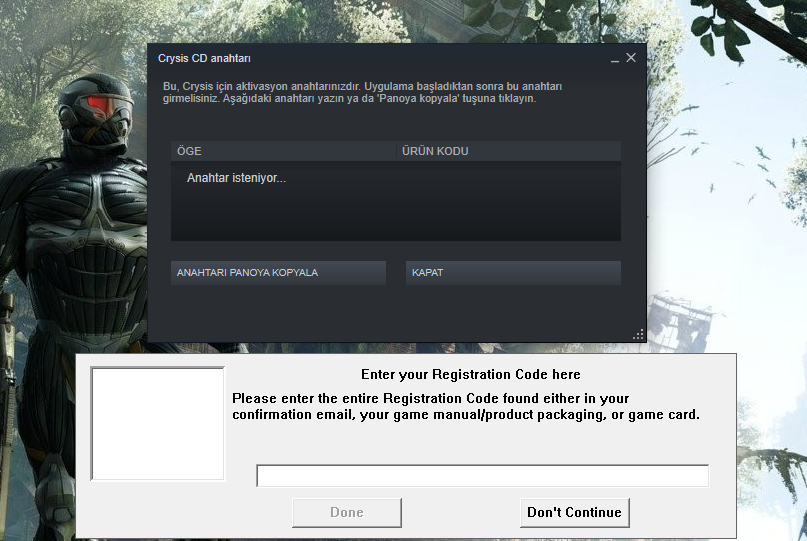 Steam'den EA Play aldım ve Crysis 1 yükledim fakat şöyle bir sorunum var. Benden Key istiyor ve Key'e hiçbir şekilde ulaşamıyorum ne yapmam gerekiyor? Steam'den oyuna sağ tık yapıp CD anahtarları dediğimde ise aşağıdaki fotoğraftaki gibi kalıyor Key falan gelmiyor.
