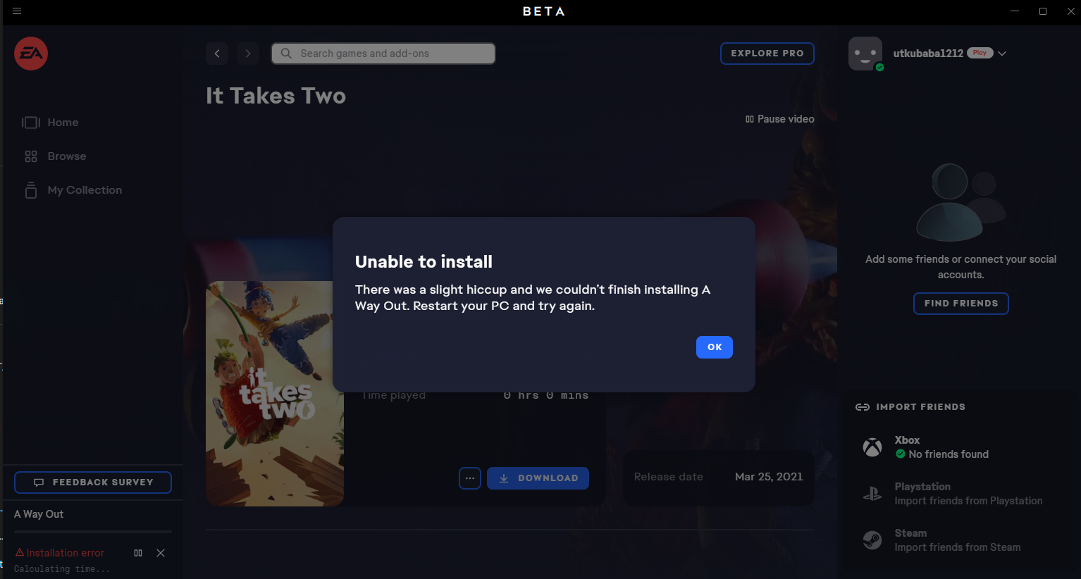 Merhabalar, Xbox Game Pass'im var ve bir arkadaşımla It Takes Two oynamaya karar verdik fakat oyunu indirmeye çalıştığımda ekteki sorunu veriyor. PC'yi çok fazla kez restartlamama rağmen hala çıkıyor. Yardımcı olabilecek var mı?