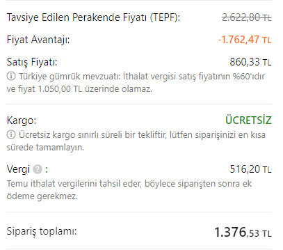 Ürün hakkında pek fikrim yok ancak indirim kuponun falan olmadan 860 X 2 = 1720 TL olan sadece ürünlerin fiyatı 30€ üstü olduğu için tek seferde değil de her birini ayrı ayrı sipariş verebilirsin. Ayrıca vergi tabii ki var ve ekleyince tek bir tanesisinin fiyatı aşağıdaki değere ulaşıyor: