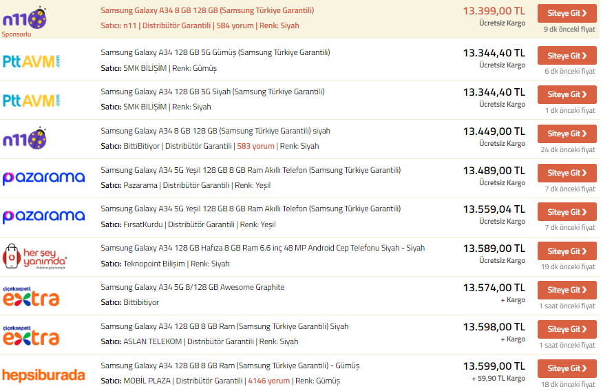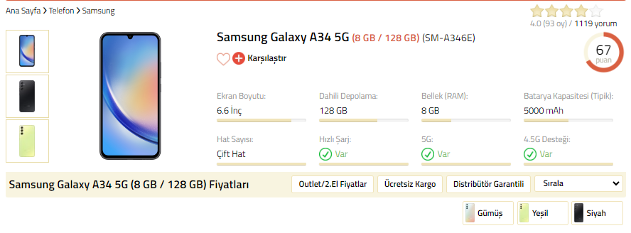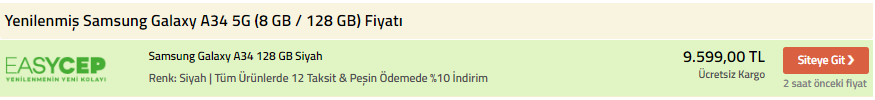 A34 almayı düşünuyorum. A34 tam fiyatı nedir? Epey sitesinde baktım fiyatlar sıralanırken bir şey çarptı gözüme. 10.000 TL'ye A34 13.500 TL'ye satılan telefon 10.000 TL'ye sizce alınır mı? Site güvenli mi? Fotoğraflar aşağıda: