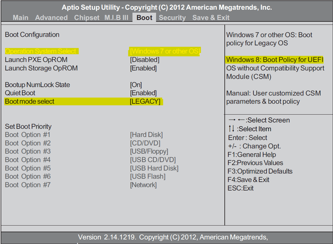 Operation System Select altından Windows 8 seçin. Bu işlem CSM'yi kapatıp sistemin görüntü vermemesine sebep olursa BIOS tekrar Windows 7 ayarına geçebilir. Bu durumda yine Windows 7 kalsın ama aşağıdan Boot Mode Select ayarını dediği gibi UEFI yapın. Böylece GPT destekli UEFI kurulum yapabilirsiniz.