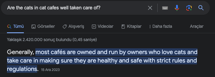 1. Random bir şekilde dışarıdan Aç-Bitir ve Süt verilerek beslenilen, nereden gelindiği bilinmeyen kedi ile Cat-Cafe kedileri arasında Lapsekili Tayfur ile Cardi B kadar yaşam kalite farkı var. Konudaki meseleye atılan taşın sesi Japonya'dan gelmez. O kedilerin lisansları ve KİMLİK KARTLARI var. Keza gelişmiş ülkedeki her hayvanın bir kimlik kartı olur ve bu kimlik kartında yazan gerçek kişi ya da kişiler kedilerin cezai ehliyetler vekilleri olurlar. Köpeğin ısırdığı adamdan sen hapis yatabilirsin, köpeğin ölürse ve bundan senin ihmalkarlığın tespit edilirse de ölürsün. Aradaki fark açıktır umarım.
