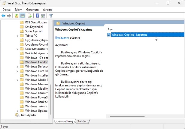 Kullanıcı yapılandırması > yönetim şablonları > Windows bileşenleri > Windows Copilot.