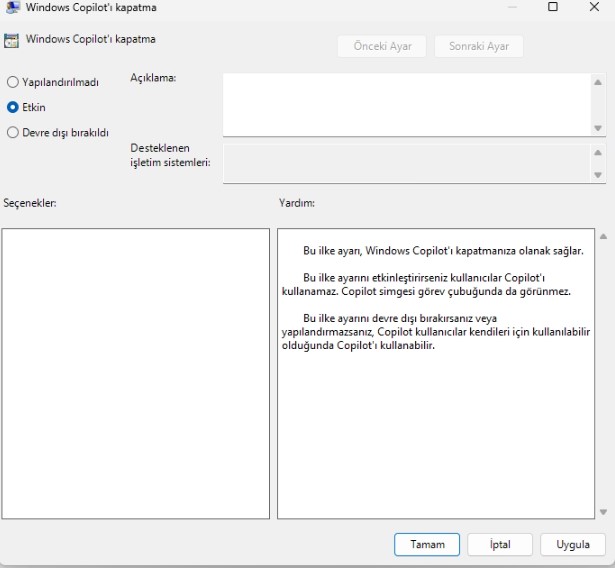 Kullanıcı Yapılandırması > Yönetim Şablonları > Windows Bileşenleri > Windows Copilot