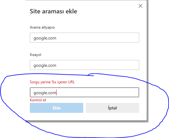 Arkadaşlar selam, Edge arama motoru değiştiremiyorum. En alt kısımda " sorgu yerine %s içeren URL " buraya ne yazmamız gerekiyor? Yardımcı olursanız çok sevinirim. Teşekkürler.