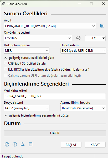 Sizin USB bellek sorunlu mu? Önce görseldeki gibi FreeDOS yapın. Ardından Bilgisayarım'a girip USB belleğe sağ tıklayıp NTFS olarak biçimlendirin.