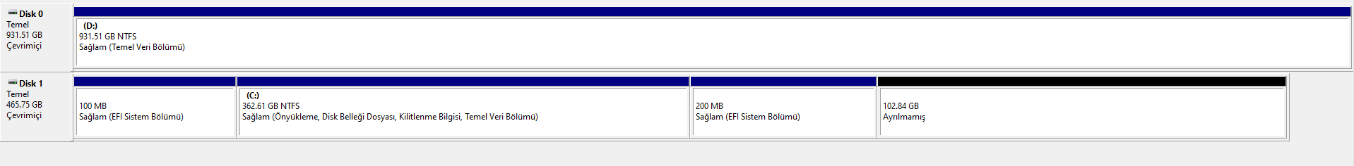 İlginç şekilde fotoğrafta gözüken 100GB alan ile diğer alanı birleştiremiyorum. Onları birleştirmemin yolu varsa EFI'yi silmesek de olur.