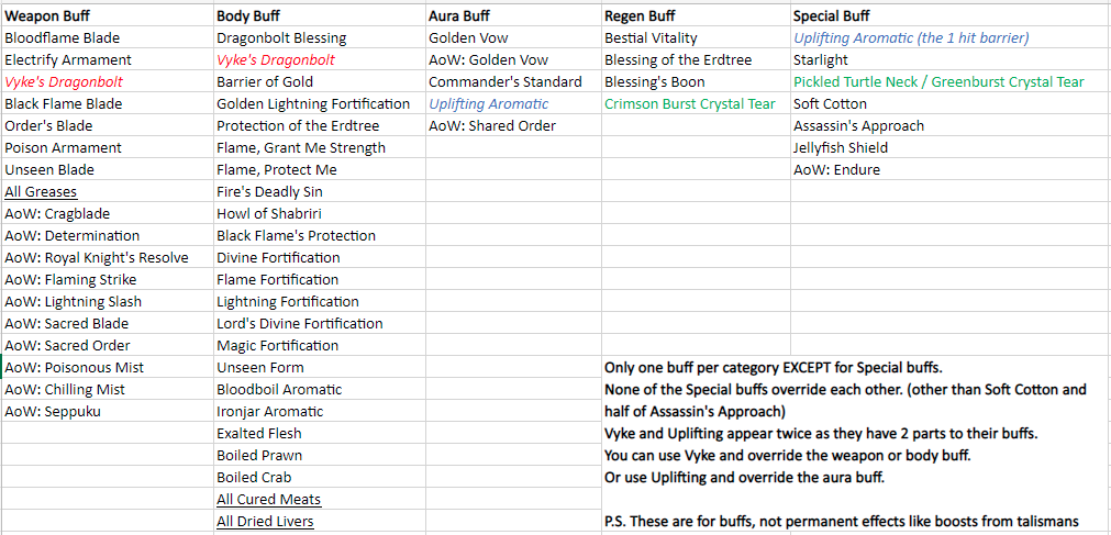 1 silaha (en hafif hançer) karakterin saldırı gücünü, savunmasını ve stamina hızını artıran Ash of War takıyorum. O silahı sadece bu etki için yedekte saklıyorum. Sonra saldırı gücü ve savunma artıran efsun basıp, bu Ash of War'ı kullanınca eski kullandığım sol yukarıki panelden siliniyor. Yani etki siliniyor hangisini en son kullandıysam o geçerli oluyor. Halbuki efsun açıklamasında kutsar yazıyor ama kutsama falan boş oyun kodlaması gereği demek ki efsunlar da, oyun içi tek kullanımlık itemler de, Ash of War'lar da aynı Buff'ı verdiği için üst üste eklenmiyor.