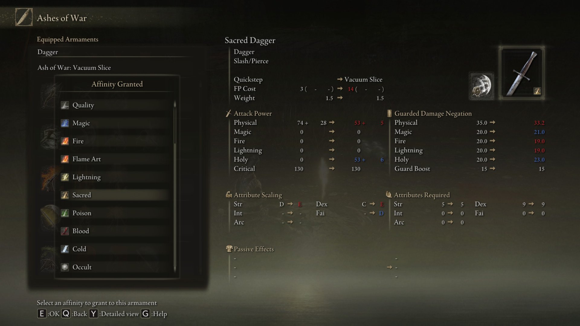 Örneğin yukarıdaki görselde seçtiğim Ash of War "Vacuum Slice", bu Ash of War normalde büyülü bir Ash of War değil. Görünüşte tamamen fiziksel güçle ilgili olan herhangi bir büyü barındırmayan bir Ash of War. Ancak bu Ash of War'ı kullanırken oyunun bana sunmuş olduğu Affinity seçenekleri arasından Sacred olanı seçersem silahımın Faith istatistiğinden scale almasını sağlayabiliyorum ve ayrıca silahıma Holy hasarı da ekliyorum. Sistem kesinlikle çok esnek ve yapmak istediğiniz her şeye uygun.