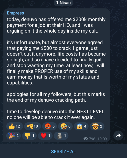 Additional related info: This joke's idea came naturally to me because i have ACTUALLY been offered a LOT of money from various jobs so far for multiple softwares companies, servers development, and much more including a Denuvo offer which i GoT last year. Maximum i was offered was $250k monthly, but it was to develop my own DRM against video Games and develop constant Security measures for their servers. İ have immediately refused it, because despite it was Very easy task for me, i will NEVER GO against my ethics & morals, for i truly believe that video Games is beautiful art and must be valued & preserved without any limitations. And of course —