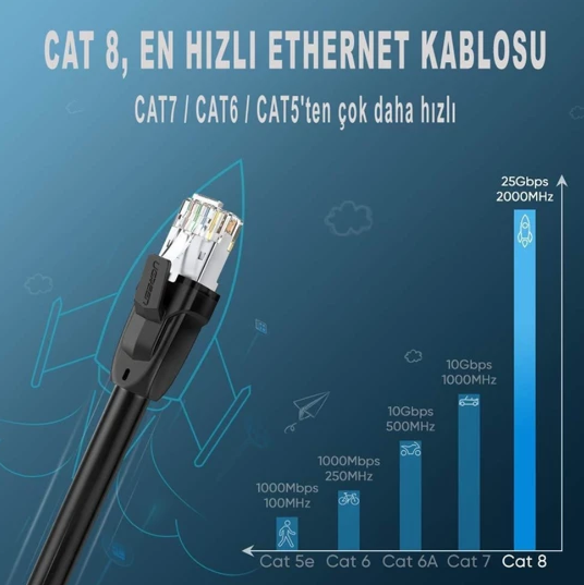 Bence Cat8 almasının da pek mantığı yok. Zira internet hızı çok çok altında kalıyor. Cat 6 işini görür. Hadi biraz esnek davranılsa Cat6a alınabilir.Markadan çok kablo modeli önemlidir diyor arkadaş, bir nebze doğru fakat CAT 8 kablo aldıktan sonra incecik kalitesiz bir kablo almak olmaz. Dediğim gibi Ugreen CAT 8 kablo piyasanın en iyisidir diyebiliriz.