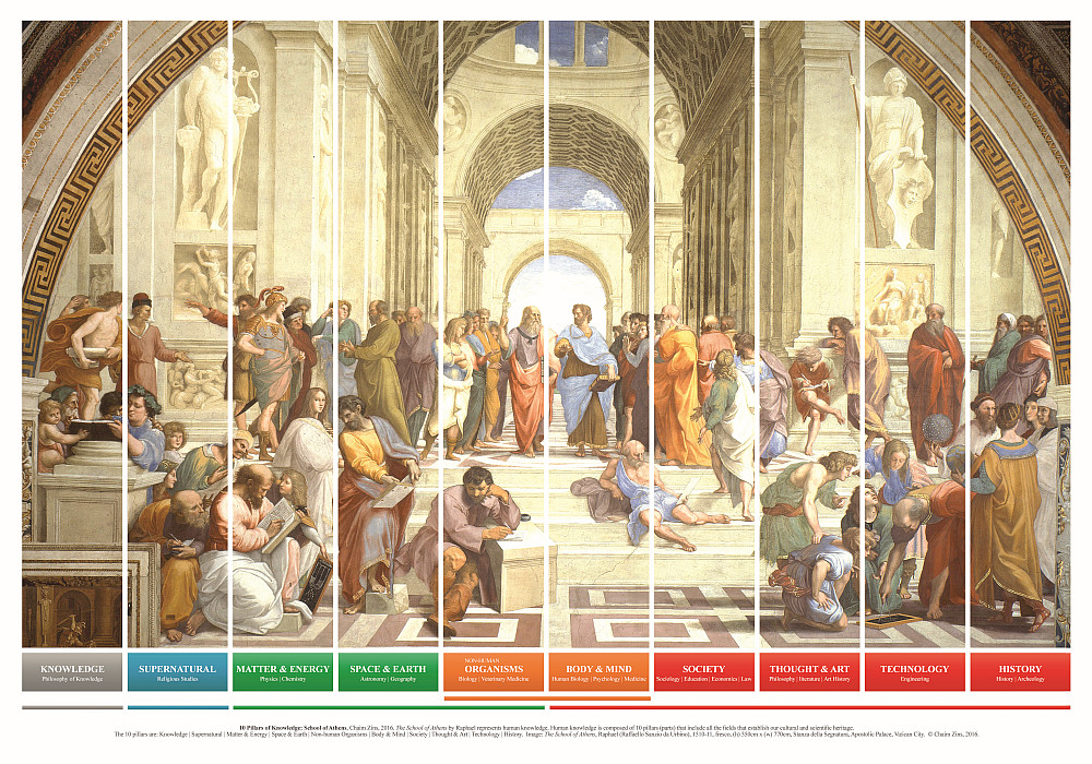 Bu tabloda aradığınız her şey var. Atina okulu, klasik antik çağlardan en büyük matematikçileri, filozofları ve bilim adamlarını bir araya getirerek fikirlerini paylaşarak ve birbirlerinden öğrenerek temsil eder. Bu figürlerin hepsi farklı zamanlarda yaşamıştır ama burada tek çatı altında toplanmıştır. Aşağıdaki resme bakarak ne demek istediğimi daha rahat anlarsınız. Çok büyüleyici bir tablodur.