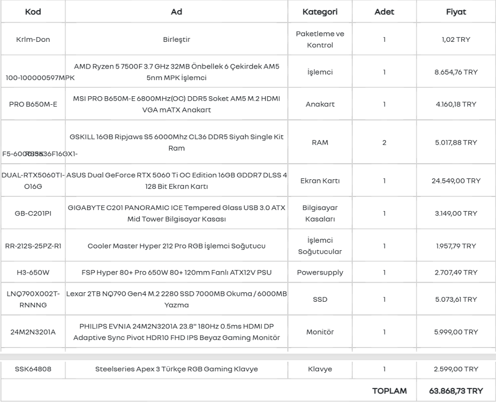 Bedavaya almışsınız bende 2-3 ay sonra 5060 Ti 16 GB- 7500F'li bir sistem düşünüyorum klavyesi monitörü mouse 65 bin lirayı buluyor.
