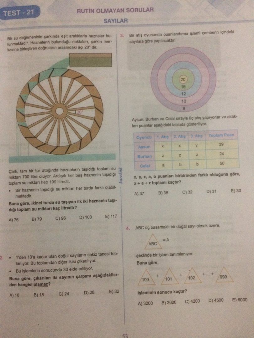 Benim gözümde TYT matematik orta seviyede en iyi üç yayın; 345, Bilgi Sarmal ve 3D'dir. Sen zaten 345 ve Bilgi Sarmal çözerek iyi yapmışsın. Ama üslü ve köklüde nasıl sorun yaşadığını tam anlayamadım. Birey A ile başladığından çıkarım yaparsam bu yıl 0'dan başladığını sanıyorum. 0'dan başlayan öğrenciler genellikle tekrar yapmada bir eksiklik yaşıyor. Ben sana 1-2 haftada bir genel tekrar yapmanı öneririm. Aynı zamanda çözemediğin veya sorun yaşadığın sorulara dön ve tekrar bak. Hatta o soruları kesip bir deftere yapıştırıp, toplayabilirsin. Böylelikle sene sonu geldiğinde, ben hala bu sorularda sorun yaşıyor muyum diye dönüp bakabilirsin. Onun dışında Orjinal ve Supara gibi yayınlar hakkında pek bir fikrim yok. Ve ne yazık ki yoğunluktan dolayı bu yıl ki zor yayınları inceleyemedim. Ama zaten TYT'de zor kitap çözmeyi pek mantıklı bulmuyorum. Onun yerine 2 tane orta seviye kaynak + problem kitabı + bol bol deneme öneririm. Kalan enerjini ve zamanını da AYT'ye yatır.@adn1925 hocam TYT'ye Birey A ile başladım ardından 345 çözdüm, sonra Bilgi Sarmal geçtim, önce biraz afalladım ama alıştım. Genel anlamda çözebiliyorum. Üslü, köklü sayılarda kısmen sıkıntı yaşıyorum. Denemelerde netim 20-25 arası. Geometride fazla sıkıntı yaşamıyorum.